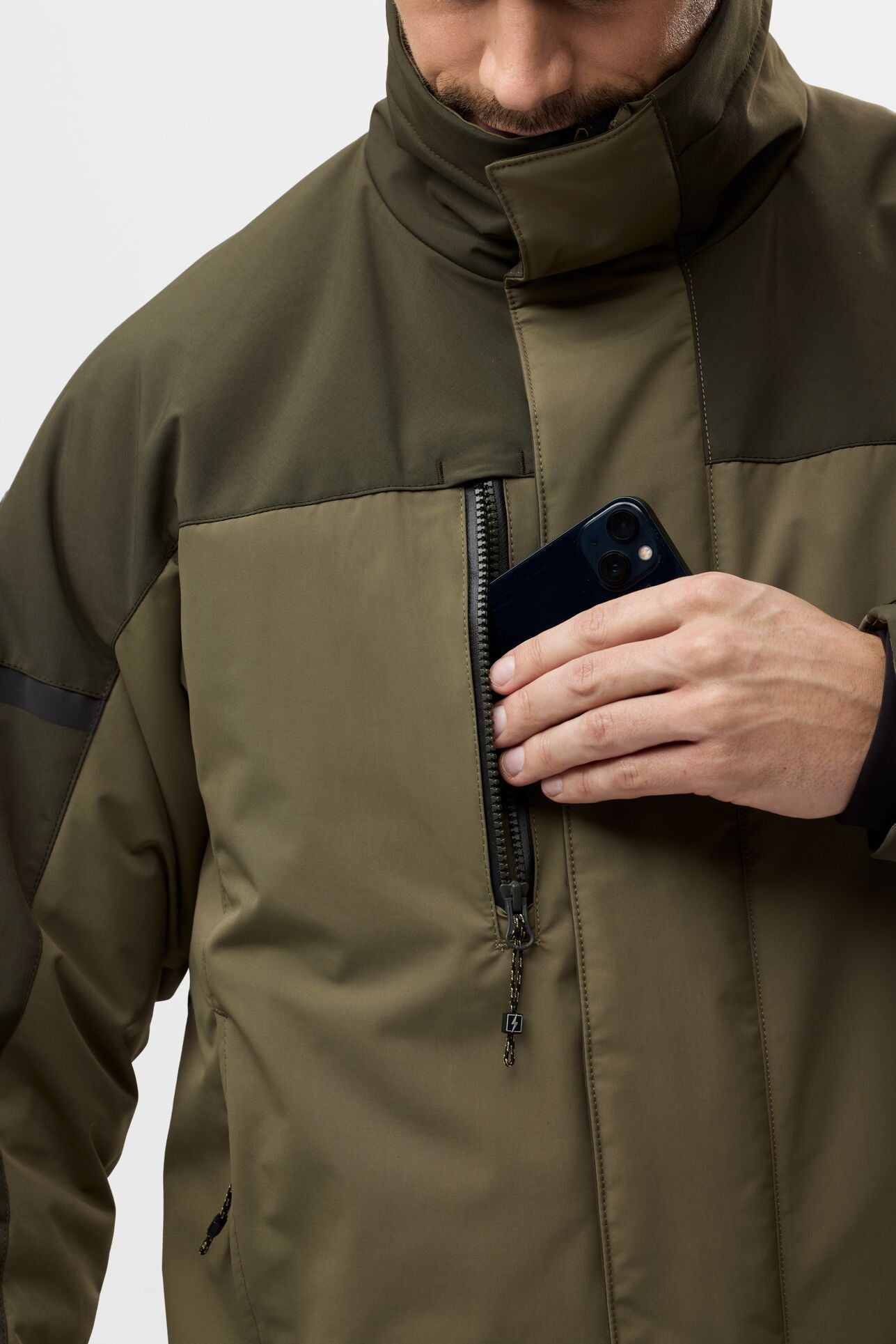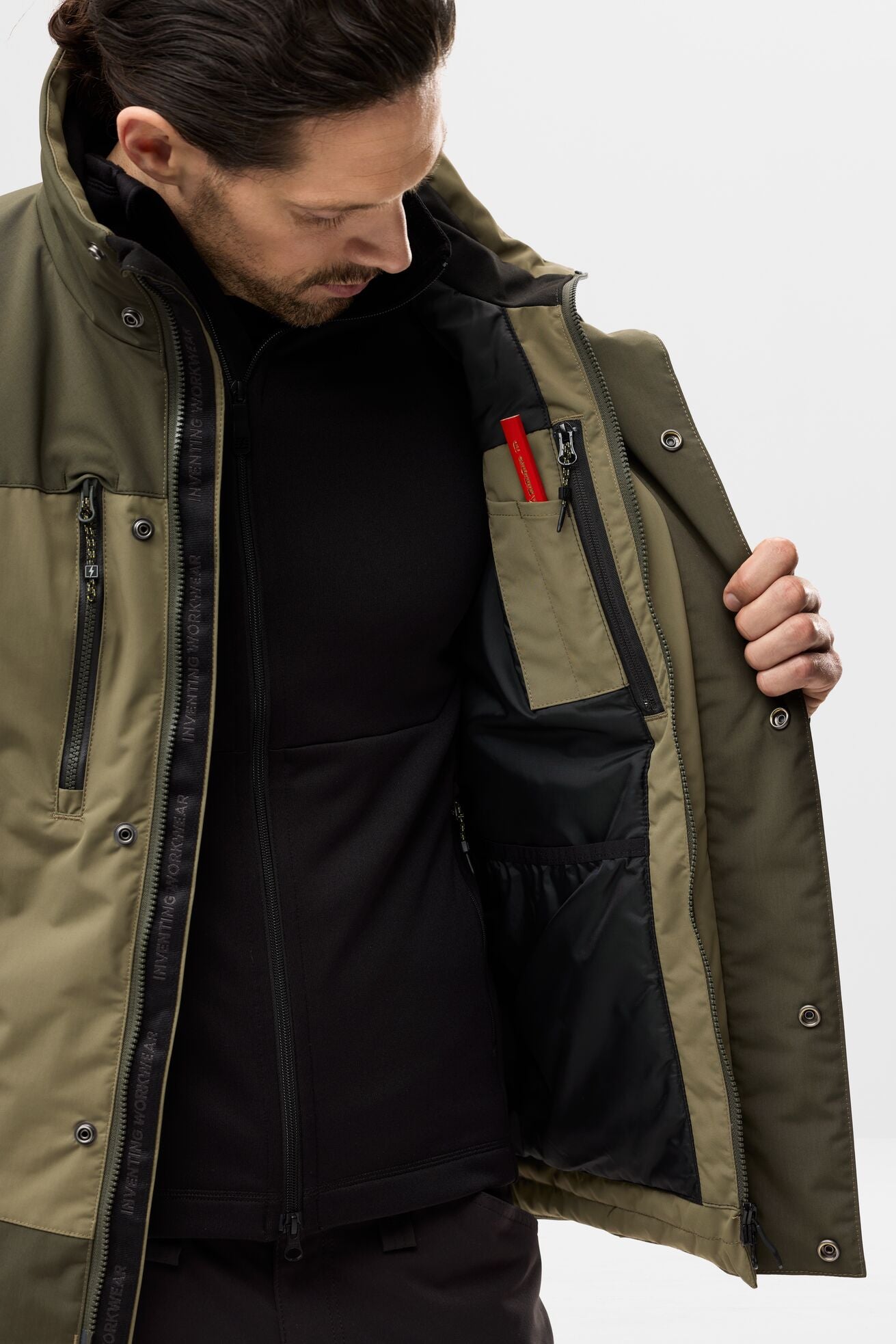 Poches extérieures : 2 poches latérales chauffe-mains à fermetures à glissières, 1 poche poitrine à fermeture à glissière avec porte-badge d’identification (identique à la Power Pocket)
